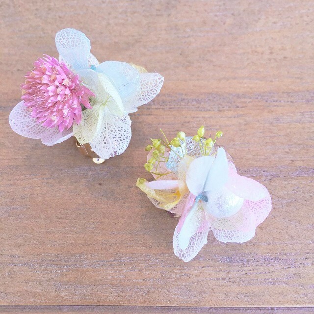 白と水色の紫陽花が涼し気で、写真では見にくいですが、コットンパールが真ん中についています。