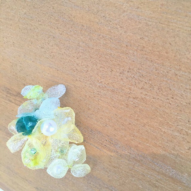 真ん中に置いた深い緑色のビーズがレジンでとろんとしていい感じの存在感を放ってくれました