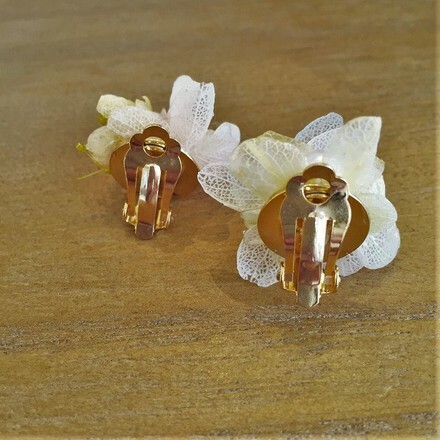 | カスミソウ、紫陽花、千日紅などをしようしています。 淡い色の色んな色を集めて、カラフルに仕上げました。 カラフルでも、耳たぶの上におさまるデザインですので、使いやすいです。 耳元に、そっとお花を咲かせてください。 金具は蝶バネ式で、素材は真鍮です。 ◇価格は1,500円+税です。 |